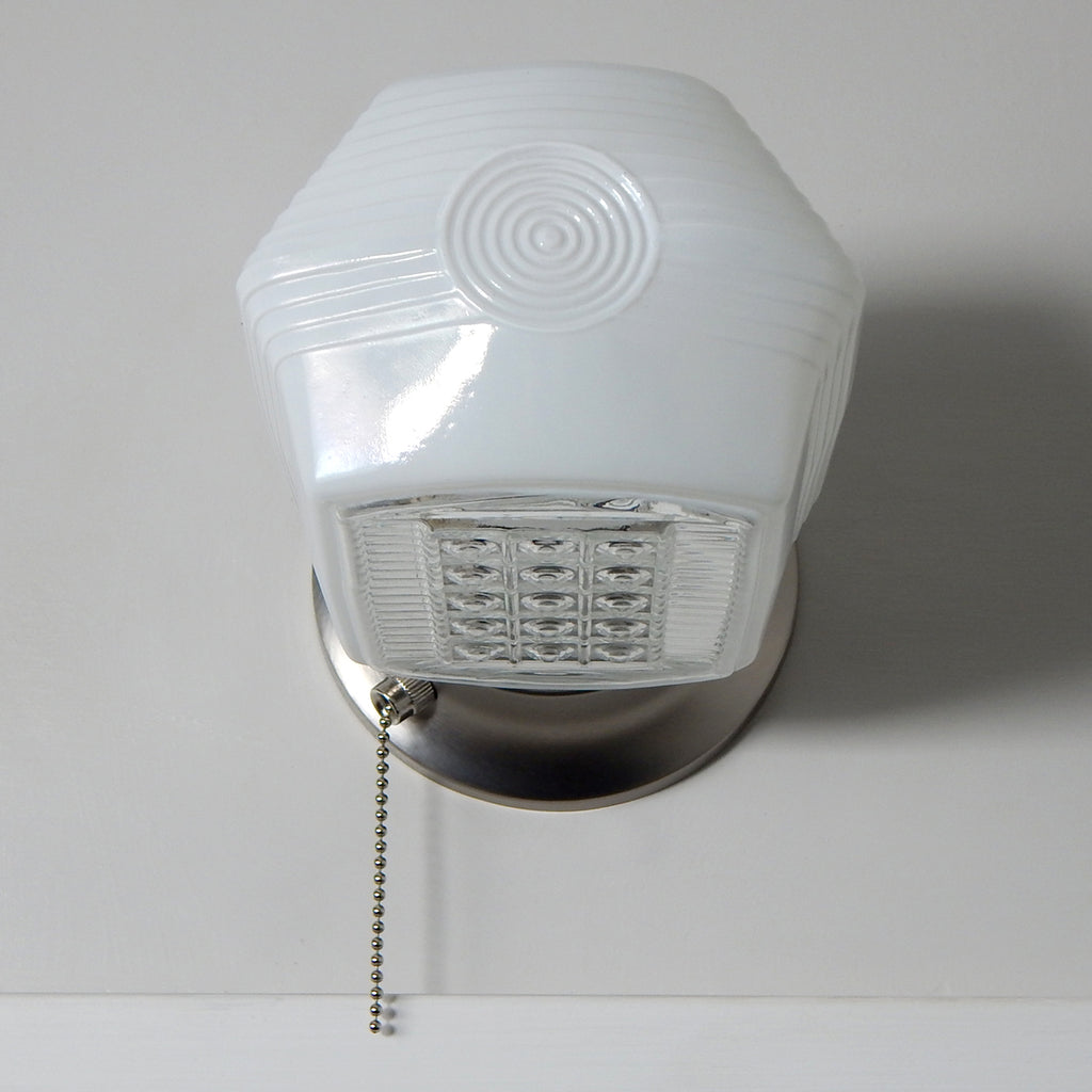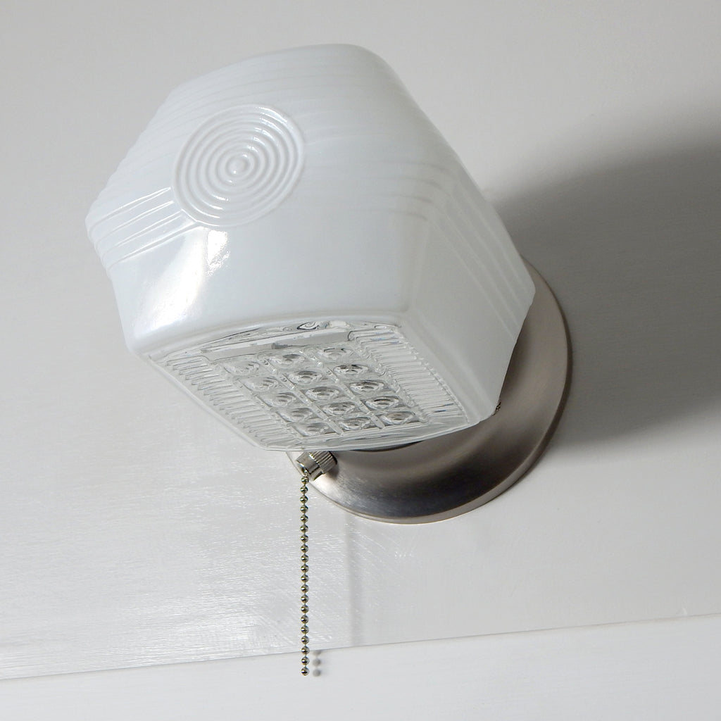 Illuminate your kitchen or bath with authentic mid-century style. This fixture pairs a stepped enameled glass shade with a satin nickel base. Designed to echo the Streamline Modern aesthetic of the late 1930s through the 1950s, its geometric lines and soft glow make it a perfect fit for period restorations and nostalgic interiors alike.