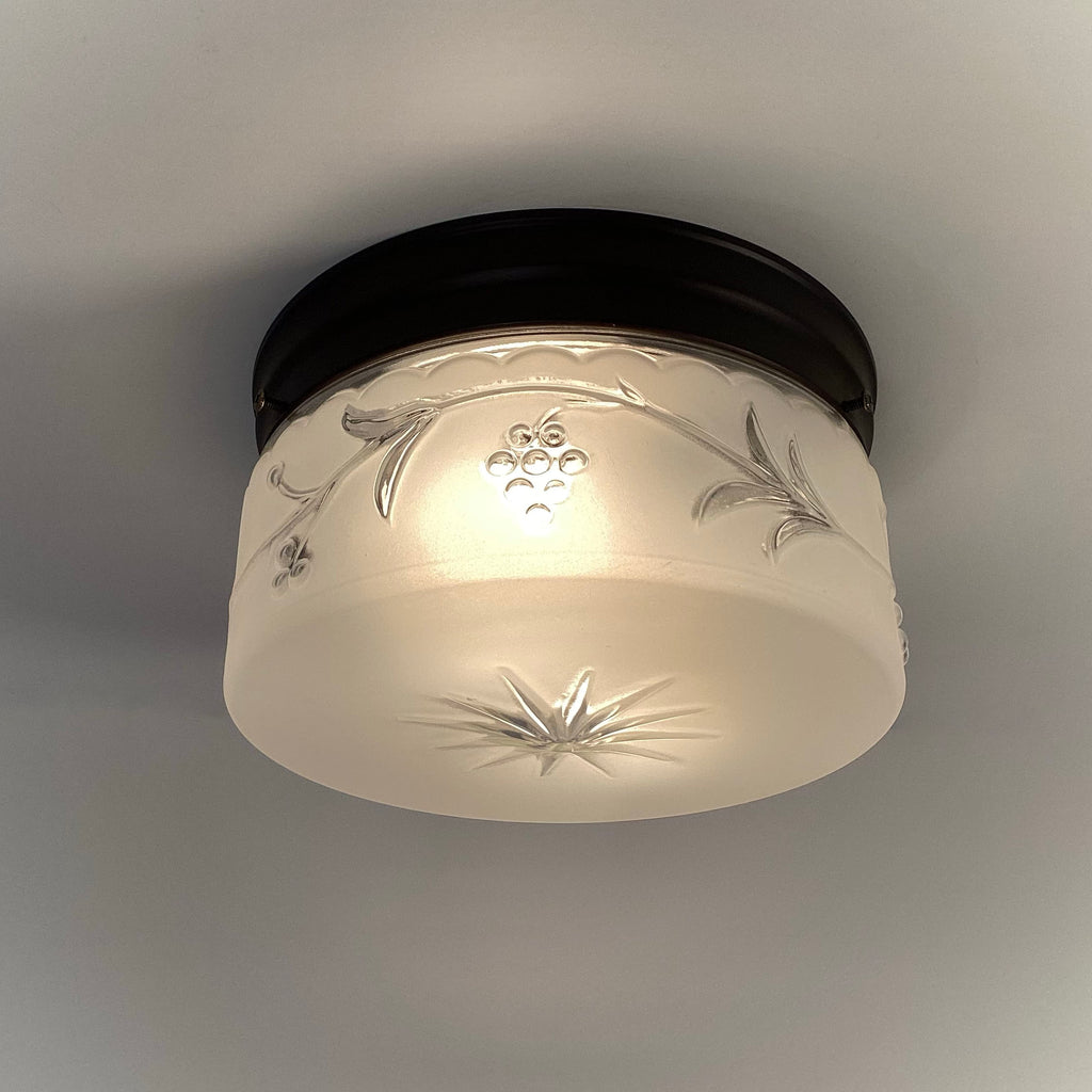 Bring timeless mid-century charm to your home with this beautifully preserved frosted glass ceiling light. Crafted during the transitional era between the late 1940s and early 1950s, its pressed glass shade features a raised grapevine motif accented by an embossed starburst base. This design perfectly captures the optimism and artistry of post-war American homes.