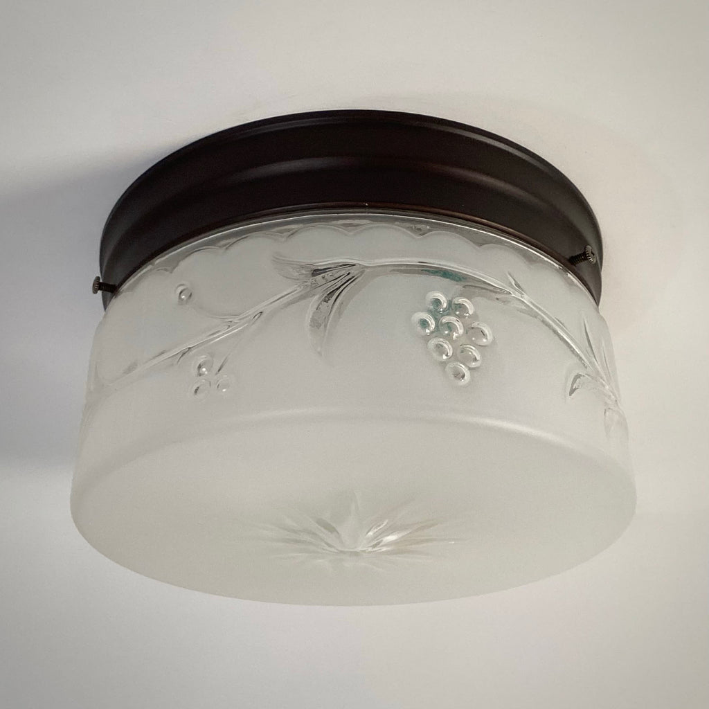 Condition: The glass is in vintage condition with only minor inconsistencies in the etched glass finish and a small nick in the bottom of the shade. The steel ceiling pan fixture base with a provincial bronze finish is new and U.L. Listed.