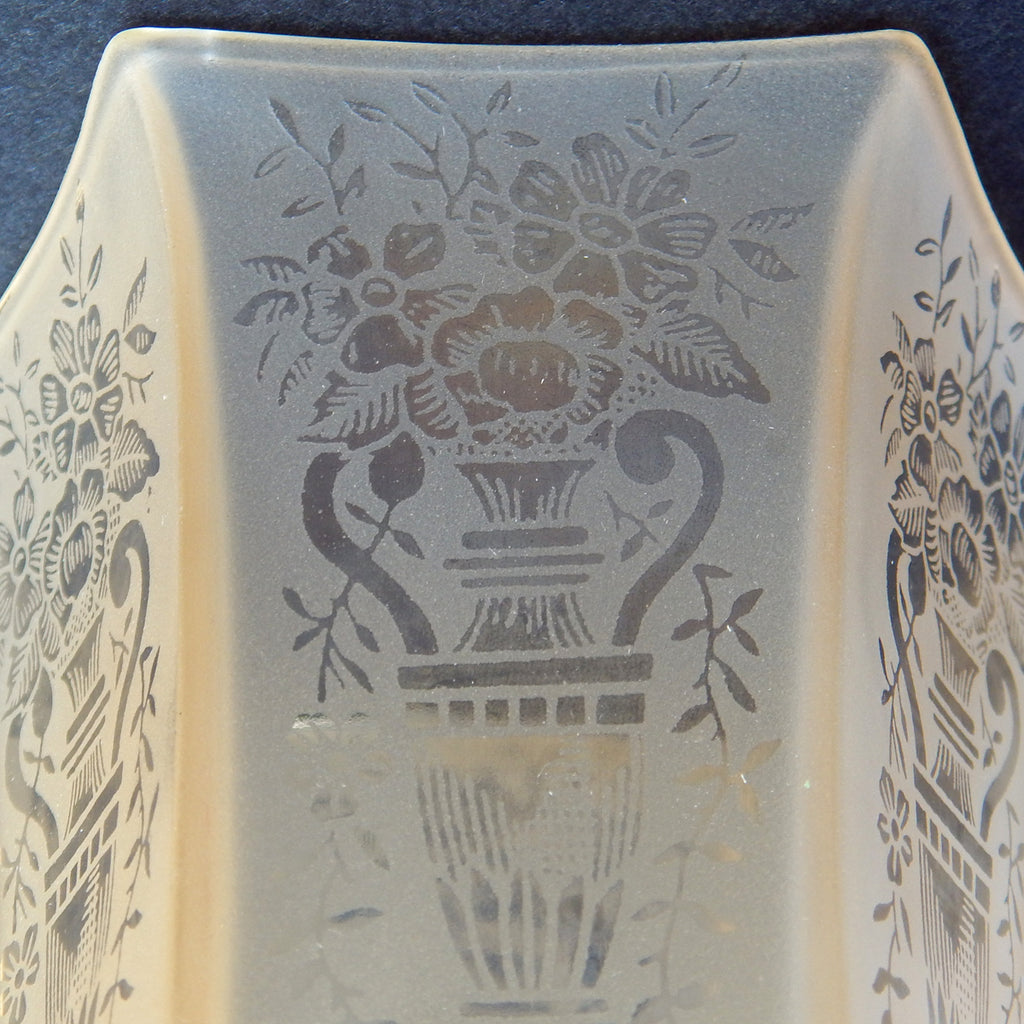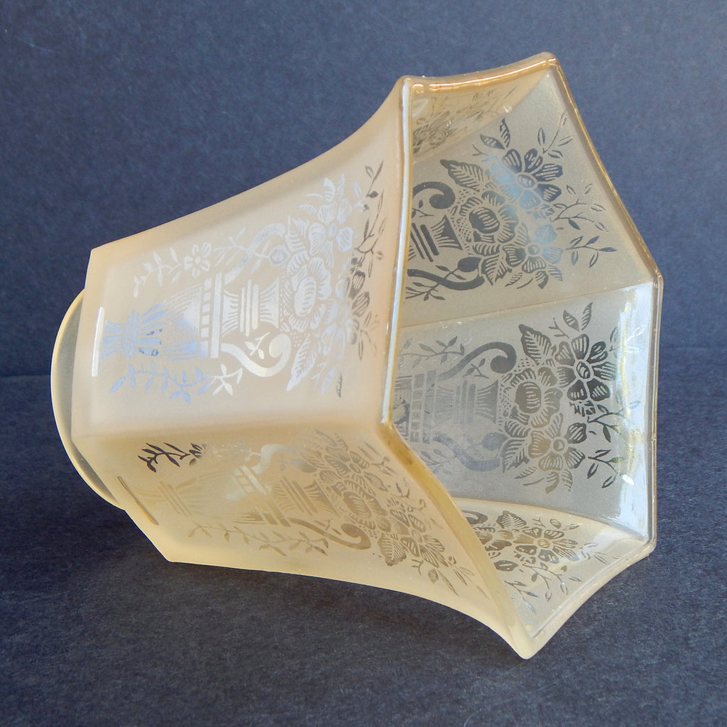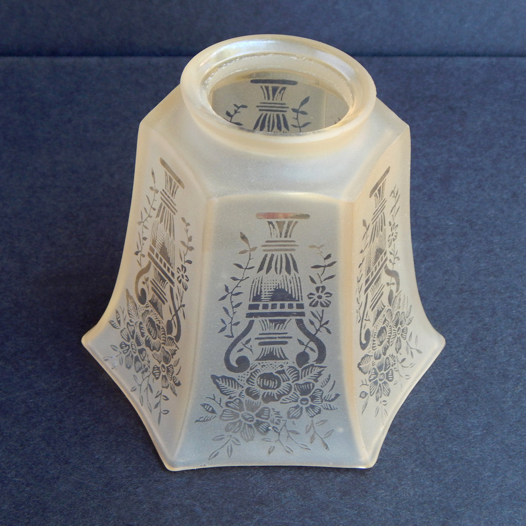 Step back in time with this charming vintage glass shade, featuring a softly frosted finish and a delicate etched floral urn design on each of its six panels. The subtle, smoky accents catch the eye, while the flared hexagonal shape adds period elegance to your lamps or wall sconce.